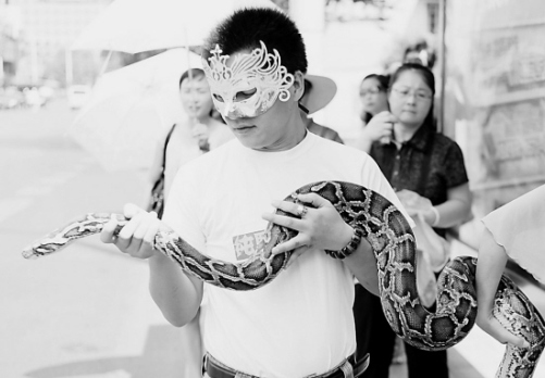 昨天上午,杭州莫干山路密渡桥附近,突然出现一名头戴面具怀抱大蟒蛇的男子,吓得路人直往后退。男子见人就问:“你们家有没有落榜生,只要20万,我就能把他(她)打造成为名艺人。”