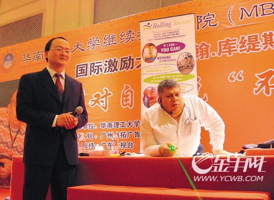 本报讯 记者夏杨、通讯员蒋开球摄影报道:他没有双腿,却能潜水;没有双腿,却能驾驶汽车;没有双腿,却是运动冠军;没有双腿,却先后到过190个国家,受到南非总统曼德拉接见,与美国前总统克林顿同台演讲……近日,受华南理工大学继续教育学院邀请,澳大利亚国际激励大师、只有半截身躯的约翰库缇斯与该院2000多名企业管理研修班学员作了一场题为《别对自己说“不可能”》的励志演讲。