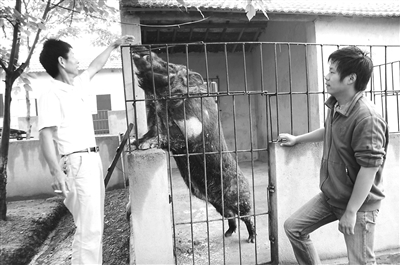 本报讯(记者 蔡早勤 通讯员 保升 熊明木)昨日,在黄陂区鲁台社区天井村一处山坡地的围院里,一名小伙子正在给一只野猪喂食。小伙子叫鲍风雪,今年25岁,是武大法学专业的本科生,毕业后他当起猪倌,专养野猪。