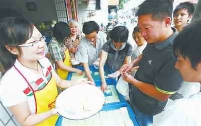 8月2日,在江苏省泰州市海陵区东进小区,大学生吴可嘉(左一)为顾客介绍自己制作的彩色豆腐。