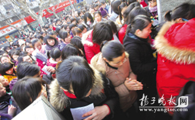 “大家可以考虑我们的学校,拿的钱不比当老师差,还帮大家缴五险。”记者看到,一些考生一走出考场就不由自主地被现场来招人的培训机构的广告单所吸引。一家培训机构的招聘人员向记者倒出苦水:“江苏省‘五严’规定出台以后,中小学里的老师都不敢出来上课了,现在培训机构都在闹‘教师荒’。而今天来考试的不少人都属于‘种子选手’,可以培养成我们的骨干,所以老总让我们出来‘挖挖’。”不过这位招聘人员对“形势”看得也比较清楚:“考得好的肯定还是会选择去当老师,既稳定社会地位又高嘛。”