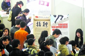 现场:今年,北大招聘会220个摊位两周前就预订一空,30多家“迟到”的企业压根儿没订上展位,一位家政管理企业的招聘人员只好手写了一份招聘广告,在现场“移动招聘”。仅一家代理8家日本企业的人力资源公司就占了3个展位,“不要求日语基础,日本就业”的醒目广告令不少应聘者放慢了脚步,40个招聘职位,一上午就收到了上百份简历。