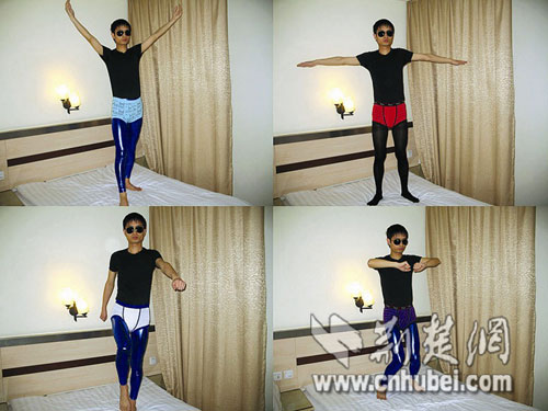 荆楚网消息 (楚天都市报) (记者黄珍)腿上裹着连裤黑丝袜或蓝色亮面紧身裤,内裤当成外衣穿……男孩小强(化名)打扮成这副模样,站在宾馆的床上做体操,并将这些雷人照片传到网上(如下图)。“现在流行伪娘,为了吸引眼球,我豁出去了。”小强在帖子中这样解释自己的异行。