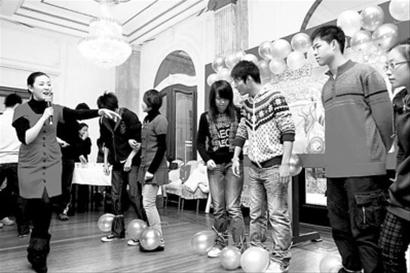 “亲一个,亲一个……”昨天的派对现场,两位男生因违反游戏规则被罚隔纸亲嘴,学生们的起哄声“一浪高过一浪”,不过,两人终究因“抹不开面子”,以“迅雷不及掩耳之势”蜻蜓点水了事。现场,不少参加派对的学生也是经过精心的装扮,一些女生化了淡妆,换上了高跟鞋和淑女装。还有一些男生戴着超大耳机,一副潮人装扮,派对的节目也是由学生自编自导的。