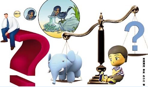 《曹冲称象》是一篇赞扬小孩聪明的文章,五六岁的曹冲就能够想到用石头代替大象称重的方法。同样是在这本课外教材里,《曹冲称象》也被改成了雷人的题目,“不用称石头的方法,还能想出更好的办法来称象吗?”