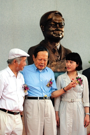 杨振宁1993年成为东莞理工学院名誉院长,东莞理工学院请雕塑大师潘鹤为他新建了一座“杨振宁铜像”,安放在学校图书馆的门口。杨振宁此行就是出席铜像揭幕仪式的。
