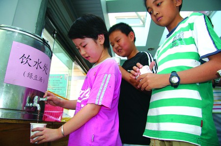 24日,槐荫区中小学校进行了本学期的阶段性测试,记者在济南市经七路第一小学看到,学校为学生们熬好了绿豆汤,学校卫生室为每个教室准备了藿香正气水、人丹、清凉油等防暑的药品,保证学生安心考试。