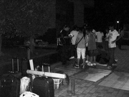 当时,大部分学生带来的钱已经用完了。有的一整天没吃饭,有的连回家的路费也不够了。晚上10点半, 20多个学生蜷在中信国际大酒店停车场的绿化带边,打起了地铺,身边堆满了大大小小的行李。14名女生和9名男生(除9人外,还有4名男生滞留其他地方)流落街头。