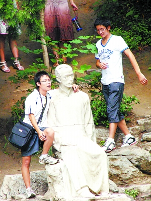 为了留下记忆,很多游客争相和校园内的雕塑合影。“安坐”在荷塘一角的“朱自清先生”非常受青睐。有的游客和“老先生”勾肩搭背,更有甚者,直接坐在“老先生”腿上照相。