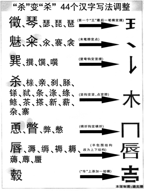 据《信息时报》报道,《通用规范汉字表》拟对44个汉字“动刀整形”,调整其写法,记者留心发现,44个汉字中,不少字都是平时的常用字。比如:“琴”、“唇”、“亲”、“杂”、“杀”等,而新规范的写法又与原字只是个别笔划上略有变化,整体相差不大。