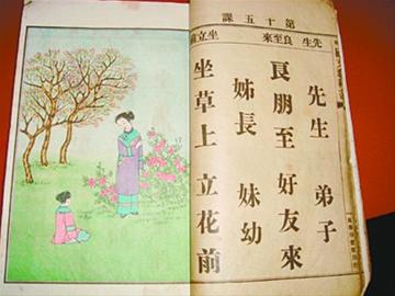 王金星收藏的清朝光绪年间 《最新初等小学用国文教科书》一套共10本,由商务印书馆出版发行,图文并茂,相当于现在的语文。记者翻看后发现,课本印刷相当精美,里边的插图十分丰富,甚至还有彩色的图片。第一册第一课要学的是八个大字“天地日月、山水土木”,第二课学的则是“父母子女、井户田宅”。另一套同样由商务印书馆发行的小学国文教材,是民国期间当时教育部审定的《初等小学校新国文》,这套教材在第一课之前特别注明:“国民学校不分男女,本书兼收女子材料,以便男女共学之用。 ”其中,第一课要学习的是一个“人”字,课文还配有插图,画的是一家老少7口人。这套国文教材所选用的内容十分丰富,包括有政治、经济、军事、法律等诸多领域的文章。