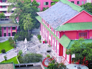 事件:执信中学仿古主楼楼顶突倾泻了一侧的绝大部分瓦片,楼前广场成一片废墟