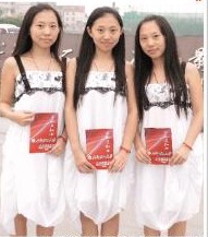 这三位女生着统一的白花连衣裙、白色高跟凉鞋;长发披肩,头顶用相同的金色发卡夹住一缕;左手都戴着红色吉祥绳。早在今年7月初,学校师生已经知道该校录取了三胞胎,她们在今年高考成绩不错,都上了河南省艺术类本科线,报读的是播音与主持艺术系播音主持专业。用一位男生的话来说,可真是“等了两三个月,终于见到传说中的美女了”。