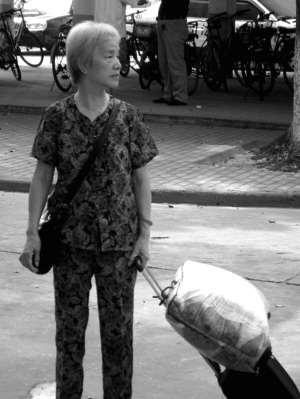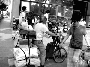 爷爷辈的送新族——一位头发花白的老者骑着一辆电动车,车后绑满了大大小小的包裹、箱子。一个女孩皱着眉头对老者抱怨着什么。原来,女孩因为父母没能陪同前来非常生气,她向老人埋怨说,别人都有父母代办手续,而自己必须独自排队缴费。老人的银发在风中显得零乱,额头上渗出的汗珠在秋日的阳光里闪闪发亮。