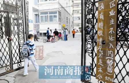 9月15日上午7时许,郑州市伊河路与桐柏路交叉口附近的长宏花园小区门口多了个牌子:因有特殊原因,不是本小区业主不让入内(幼儿园)。落款为长宏业主。同时,小区业主也当起“门神”,守着小区大门,不让学生进入小区内长宏幼儿园上课。