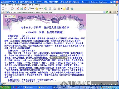 在启事中,“南宁讲师悬赏征婚”特别说明,为表征婚诚意,一旦征婚成功,对网友转帖、媒人中介等人士有2000元至5000元不等的酬谢,总额不超过5000元。“南宁讲师悬赏征婚”还特别声明他不是有钱人,经济适用男一个,希望不要出现骗婚的事件。