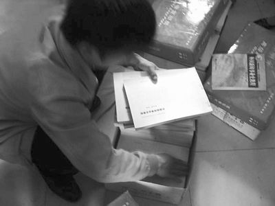 记者进入开封市顺河区的一家复印店,看到柜台上摆放着4箱教材的复印本,又在一个角落里发现更多“存货”,旁边还放着原版教材。
