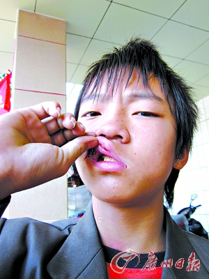 昨天中午,记者在中堂镇和新塘镇交界处的大敦医院找到了郝涛,14岁的孩子一脸痛苦,他嘴角上还挂着没拆除的手术线,一颗门牙已经不见了。