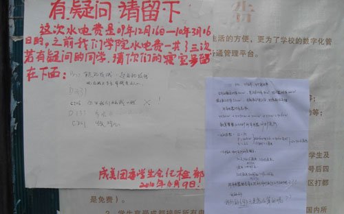 随后,该校后勤部工作人员张贴了一份通知向学生解释。通知写道:“该表为学生公寓2009年9月~2010年3月学生公寓应交水电费;实际计量水、电月份分别为2009年10月、11月、12月,2010年1月、3月(1月10日~2月28日寒假)。”