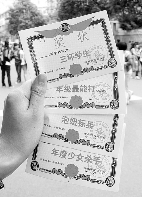 “老板,买张奖状,要那个恐怖分子的!”昨日下午,记者在成华小学西校区附近的一家文具店看到,店内墙壁上挂着花花绿绿的小卡片,几名小学生正在挑选。卡片有巴掌大小,堪称微缩版的“三好学生”奖状,不过内容却不是“三好学生”,而是“放屁达人”“三坏学生”“最佳呕像”“花心大萝卜”“潜水冠军”“傻B标兵”“霉女标兵”,甚至“最有影响力的恐怖分子”,奖状上印有喜羊羊、灰太狼、叮当猫等卡通形象。不仅奖项内容雷人,而且还落款颁奖机构为“人类潜能开发中心”“地球承制”等子虚乌有的机构。