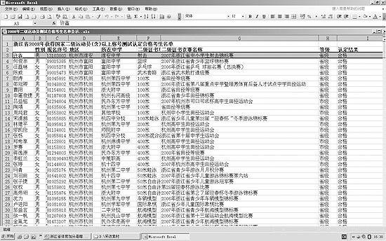 打开这个公示名单,前两行的内容分别是:“许鑫;性别:男;报名序号:13103003;地区:杭州市淳安;所在中学:淳安中学;二级证书:射击;二级证书竞赛名称:2007年浙江省中小学生射击锦标赛;等级:省级;认定结果:合格”。
