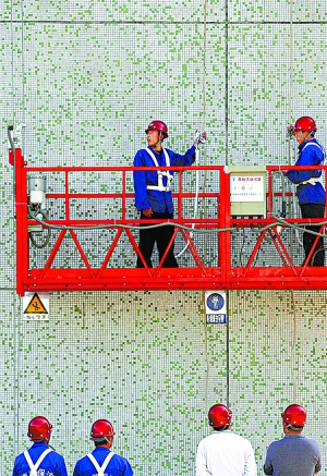 中国贸促会建设行业分会建筑物清洁委员会秘书长王东战是考官之一,他告诉记者,这些考试内容主要包括安全用具使用、安全检查、技术操作要点,以及故障判断和处理等,都是高处悬空作业人员必须掌握的技能。