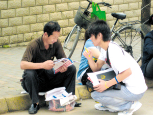 6月7日,高考的第一天。早上7点,当记者来到蚌埠市怀远县一中大门口时,发现这里除了正在等候考试的考生和家长,还有很多手里拿着大堆传单和招生简章的年轻人,并不断地往家长和学生手里塞。