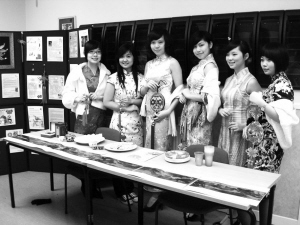 学校30多个中国女孩子里有6人带了旗袍。我们说服了最漂亮的几个女孩在寒冬里穿上旗袍,在学校里介绍中国文化。