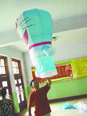 昨日,物理老师高振喜发明的机器猫造型的孔明灯正在进行试飞。(记者 李军 实习生 马克)