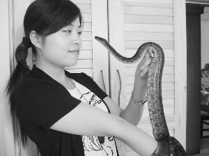 在人们的传统观念中,蛇是一种令人畏惧的动物,与之朝夕相处需要莫大的勇气。在开封,28岁美女教师朱佳却在自己卧室里喂养了两条蟒蛇近两年时间,她还专门在网上开了博客,与人们一起分享自己的爱蛇感受。