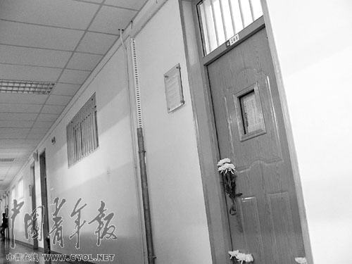 照片:教室门口摆放着吊唁的白色鲜花。 本报记者 王国强摄
