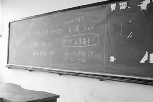 记者在第二教学楼208教室的黑板上看到两个颜色书写的内容,白色粉笔写着“听力10:00 FM76”,黄色粉笔写着“11:05 FM79”。