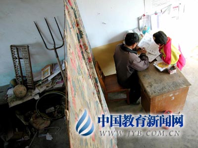 为了教学方便,杜老师的家就安在了学校所在的楼沃村,他的家在西山坡上,离学校有1500米,要翻三条沟。前年春季的一个星期天,杜老师到城里办事,回来时在山路上摔成骨折。他只在医院里住了一周时间,便提前回到学校,换下来替他代课的教师。俗话说,伤筋动骨一百天,那段日子,杜老师不能拄着拐上坡下沟到校上课,便把“教室”搬到了自己的家,在堂屋里给孩子上课,一直上了两个多月,一节课也没落下。