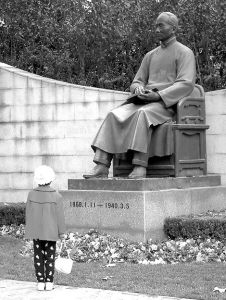 照片:2006年3月6日,上海,一个小孩站在蔡元培的雕塑前。沈井韦摄