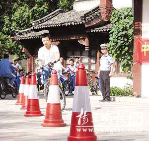 昨天下午2点,南京交警六大队率先启动了今年新学期中学生自行车“驾照”骑车考试,十二中初中二年级两个班共有100名学生“尝鲜”,结果绕桩考试中仅有4人不合格,其中3人是男生,笔试成绩则有待阅卷。在欣慰考试过关率高的同时,现场监考的交警也发现了一个潜在危险,那就是不少学生的车辆存在安全隐患。