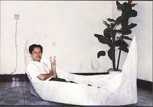 朱亚林还表示,首航成功后,他还将制作更多的纸船,组织由60艘纸船组成的船队,参加明年元旦期间举行的厦金冬泳活动,让更多人关注厦金乃至两岸之间的和平交流活动。这些活动完成后,还将就“纸船载人”、“纸船横渡海域”等申报吉尼斯世界纪录。上图为朱亚林和他造的一种纸船。 (据海峡导报)