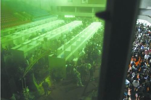 虽然拥有高达9%的年经济增长率,但国内商业、服务业所能提供的就业岗位仍不能满足每年新增的就业需求。知识型劳力过剩的情况不能避免的出现了。求职中的学生们来不及考虑这些,他们西装革履,他们挤出微笑,简历中的寸照与期待的面孔叠在一起,等待着命运的垂青。(程启凌)