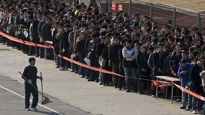 为了找工作,昨日(13日)清晨不到6时,天刚微微亮,许多大学毕业生就提前近3小时排起了长队。