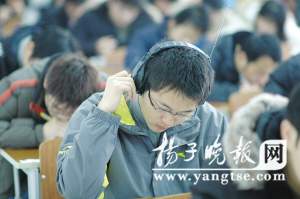 本次考试江苏省共设223个考点、26212个考场,134所高校的780489名考生报名参加考试,比去年同期增加108450人,增幅16%,报考规模再创新高,仍居全国第一。图为江苏工业学院的一名考生正在调试耳机。 杨素平 摄