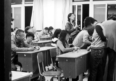 教学点的墙上贴着一些学生的进步成绩表,一名男咨询员指着其中一个高三学生的名字说,这个孩子全科补,不在学校晚自习了,家长为此已投入7 万多元。“为了孩子的将来,投入还是值得的。”他说,“孩子在学校晚自修效率不高,学校老师要管很多学生,如果你孩子不主动,老师也很难顾及到。”