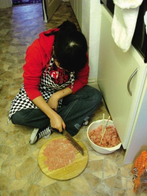和面是技术活,需要有经验的人来做,剁肉馅就是体力活了。我们是女孩子,手臂力量都不好,只能轮流来。房东家里有一把“张小泉”牌大菜刀,估计是