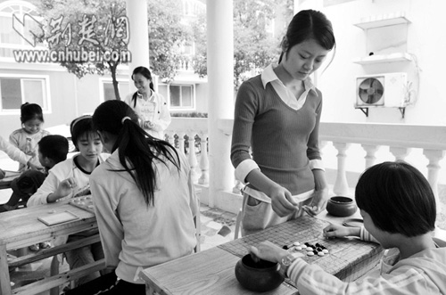 图为:课间,刘文静和孩子们切磋棋艺(右二) 记者刘蔚丹摄