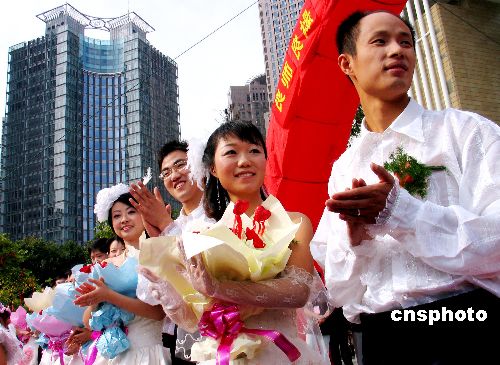 9月10日是第22个教师节,江苏南京8位教师一同举办集体婚礼。中新社发 钟山 摄