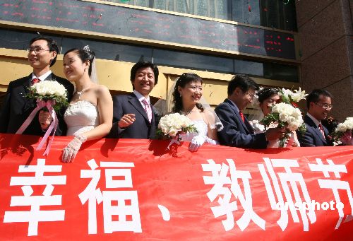 2006年9月10日是教师节,参加集体婚礼的的教师在“幸福教师节”的横幅前留影。当日,郑州市第八中学的8名教师在郑州一酒店举行集体婚礼,度过一个快乐、幸福而又难忘的教师节。中新社发 陈代述 摄
