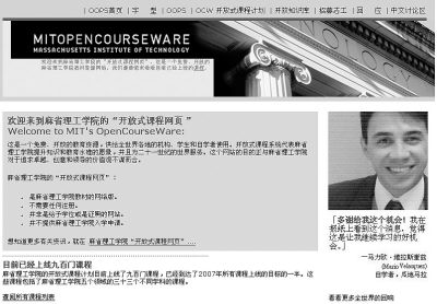 屏幕上显示出“麻省理工学院开放式课程计划”的网页。这项计划将该校课程的教材,包括教学大纲、课堂讲稿、习题解答、参考书目等内容挂在网上,免费供全球互联网用户使用,目前已囊括了33个学科的近千门课程,至今年年底还将增长一倍。