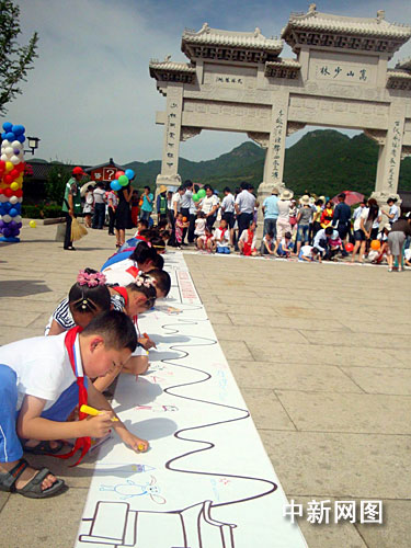 在游客中心广场, 60名儿童正在广场描绘四幅十米长卷,以“六一、我在少林放飞心中的童话梦想”为主题,这 60名少年儿童在1个小时时间内,进行色彩内容的填充,共同将少林及动漫描上未来的色彩,再现心中的传奇少林。