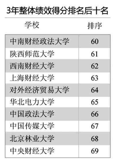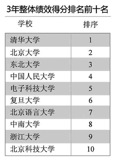 数据统计显示:有近半数高校过去3年“投入多,产出少”;另有29所高校“产出高于投入”;还有7所高校投入和产出的排名一致,“投入产出相当”。整体绩效得分前3名的高校分别是清华大学、北京大学、东北大学。