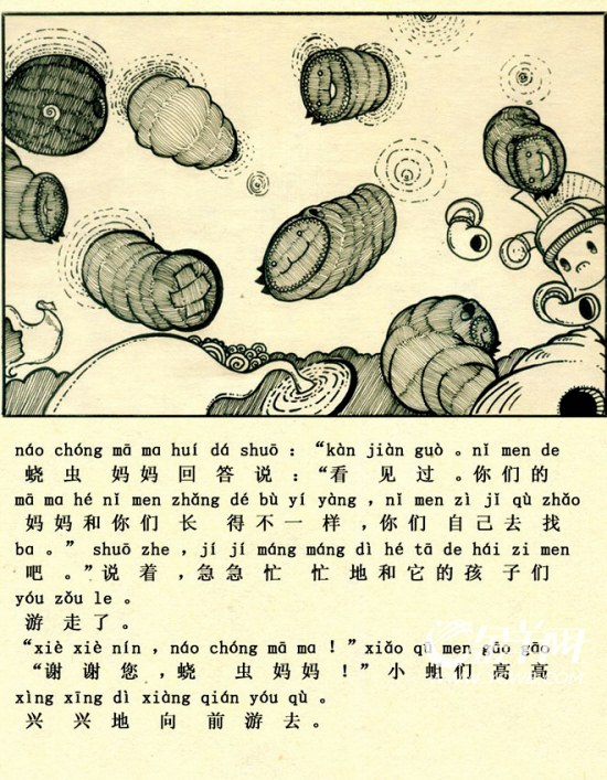 最近,关于《小蝌蚪找妈妈》原著的改编又有了新动作———有网友把《小蝌蚪找妈妈》的主角小蝌蚪改成了小蛆虫,故事里原来的配角鲤鱼、乌龟、白鹅则变成了蛲虫、线虫和屎壳郎。有一位80后的小青年还给改编的文字配上自己创作的情景漫画图,再加进文字与拼音标注,《小蝌蚪找妈妈》就这样变成了《小蛆虫找妈妈》。