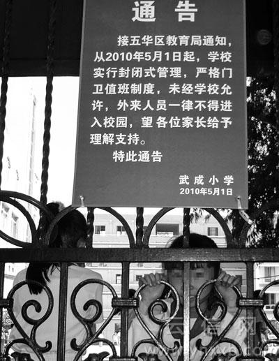 昨日上午记者来到位于篆塘的春城小学,只见门口贴着一张白纸墨字的通知,落款日期为5月4日:“接上级通知,为保证学生安全,从2010年5月1日起,学校实行封闭式管理,严格门卫值班制度,未经学校允许,外来人员一律不得进入校园。”