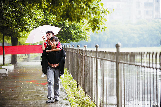 这是他俩极其熟悉的一段路程。先要走下一个有二三十个台阶的斜坡,接着绕过一个标准的足球场,然后就是一条栽种着樟树和玉兰的林荫大道,不远处还有一个篮球场。大约500米的路程,背着王理的毕明哲走起来和正常人差不多,有时还会快一些。